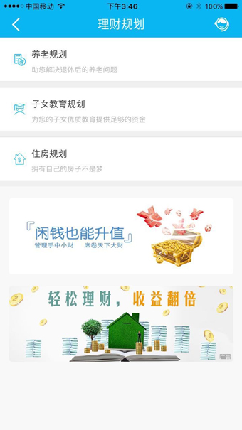 新版手机银行提供全面的投资理财服务,产品介绍信息更加详细,方便用户快速了解,除提供基金交易、债券交易、贵金属交易、理财产品、外汇买卖、代理保险、投资订单、账户商品、黄金积存、个人结售汇等常用产品交易外,新增账户外汇、专户理财、代理信托功能,提供“闲钱控”、“养老规划”、“住房规划”、“子女教育规划”等理财场景,帮助你提高理财能力,优化目标资产配置。