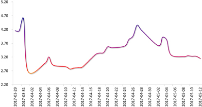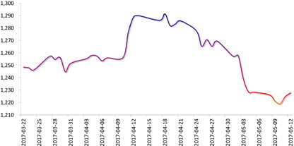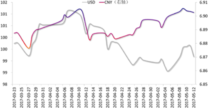 外汇市场:“一带一路”峰会召开前夕,人民币窄幅波动,当周累计小幅贬值0.04%。由于上周美国CPI数据不及预期,年内继续加息两次概率下降,预计人民币仍将维持区间震荡态势。