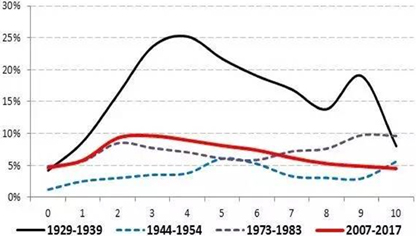 如下两图(均以危机爆发前一年的GDP为基数1,收缩为<1,1<复苏<1.1,扩张为>1.1),与前三次大危机相比,本次危机的复苏期是最长——4年(2011-2014),而且从经济增速曲线的斜率来看,本次危机虽然较早的脱离衰退,但复苏的力量是偏弱的。其背后的原因,则是经济内生新动力至今尚未显化和成形。(图1、2)