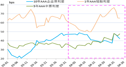 4月信用利差分化。截至4月28日,3年和5年AAA信用利差较3月末拓宽幅度较大,达到11-21BP;1年拓宽幅度较小,仅为2BP;7年持平;但长端10年期信用利差收窄4BP。短期品种的信用债流动性较好,在资金面紧张时易被抛售,且由于同业存单的利率非常市场化,因资金面紧张同业存单利率上行速度较快,从而带动信用债中短期品种的利率上行,信用利差呈现明显拓宽。长端品种由于流动性不好,利率反应滞后,且由于绝对收益率较高,可覆盖投资者高企的资金成本,因此被用来打底仓,从而长端信用利差收窄。从月内走势看,各期限的高等级信用利差均走出了先抑后扬的态势,中端5年期信用利差率先从上旬开始率先上行,其次是1年期利差自月中开始上行,10年期利差从下旬开始上行。(图4)