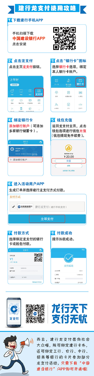 据建行有关负责人介绍,“建行龙支付”是建行整合NFC、二维码、人脸识别等各种技术,全新推出的移动支付品牌,覆盖线上线下各类场景,一经推出即得到了市场高度认可,客户、合作商户数量快速增长,各项优惠活动精彩纷呈。近期龙支付与银联二维码对接后,更是经一步拓展了受理场景,为客户提供了支付便利。