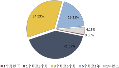 从投资期限来看,1个月以下产品发行了30款,环比减少3款,市场占比上升0.03个百分点至0.36%;1-3个月产品发行了3499款,环比减少712款,市场占比下降0.56个百分点至41.69%;3-6个月产品发行了2903款,环比减少654款,市场占比下降1.10个百分点至34.59%;6-12个月产品发行了1612款,环比减少205款,市场占比上升0.98个百分点至19.21%;1年以上产品发行了348款,环比持平,市场占比上升0.65个百分点至4.15%。(图3)