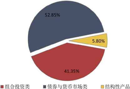 从投向类型来看,债券与货币市场类产品发行了4435款,环比减少662款,市场占比上升1.70个百分点至52.85%;组合投资类产品发行了3470款,环比减少830款,市场占比下降1.80个百分点至41.35%;结构性产品发行了487款,环比减少82款,市场占比上升0.09个百分点至5.80%。(图4)