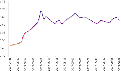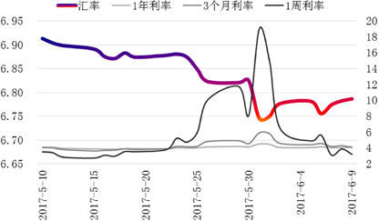 离岸人民币市场:上周,离岸人民币流动性充裕,各期限掉期点均有不同程度的下跌。受5月外汇储备连续4个月回升和强势的人民币中间价影响,离岸人民币汇率强势震荡,当周微跌100个点。预计本周离岸人民币将继续保持平稳。