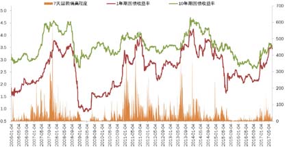 图8 1年、10年国债收益率与7天回购利率波动情况
