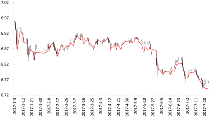 7月,美元弱势依旧未改。月初还尚能在96上方盘整,月末却已跌破93关口,当月累计跌幅达到2.94%。疲弱的美元向人民币施加的压力降低。尽管实需客盘逢低购汇和油盘购汇压力仍存,但人民币兑美元的涨势果断,7月31日收盘于6.7290,当月累计上涨0.78%。如果说6月末时,机构对于人民币走势还有较大分歧,7月末时看多人民币的情绪已经明显占了上风。(图5)