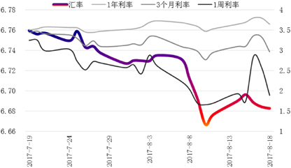 外汇市场:上周,伴随美元指数震荡反弹,人民币兑美元在震荡中小幅贬值,周五收于6.6679,当周累计下跌0.18%。整体来看,市场结售汇相对均衡,客盘结汇逐渐回归理性,呈现出观望情绪。短期内,预计人民币汇率将继续跟随美元指数波动。