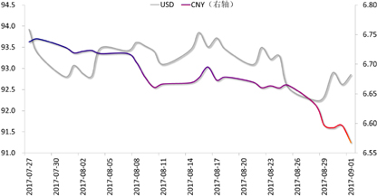 商品市场:上周初,因美元疲软,加之朝鲜发射导弹飞跃日本,引发避险需求,提振国际金价;周五美国8月非农数据不及预期,金价一度跳涨,但美元随后反弹,金价涨幅收窄,收于1330美元/盎司,较前一周上涨2.58%。