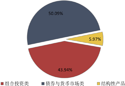 从投向类型来看,债券与货币市场类产品发行了4969款,环比增加217款,市场占比下降1.55个百分点至50.09%;组合投资类产品发行了4359款,环比增加431款,市场占比上升1.26个百分点至43.94%;结构性产品发行了592款,环比增加70款,市场占比上升0.30个百分点至5.97%。(图4)