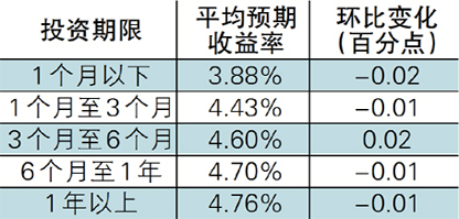 继上月银行理财产品收益率冲高回落后,本月继续表现出微幅下跌的态势。人民币银行理财产品的平均预期收益率为4.55%,环比下降0.01个百分点。除了3-6个月期限类型产品收益水平出现上涨而外,其余各期限类型产品收益水平均出现下降,但降幅均在0.01-0.02个百分点。(表1)