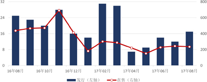 本月阳光私募产品新发行数量录得17款,环比增加5款;在售数量录得237款,环比减少8款。相比证券投资类信托,上涨势头略缓。(图7)