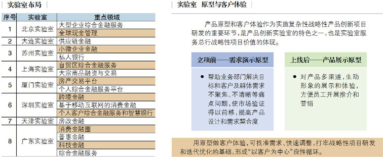 按照产品创新实验室所在分行的区域特色、市场和客户的特点以及相关业务领域的特长,根据公司金融服务的综合化、网络化、平台化趋势和个人金融服务的生活化、移动化、智能化趋势,各产品创新实验室已支持13个重点业务领域。