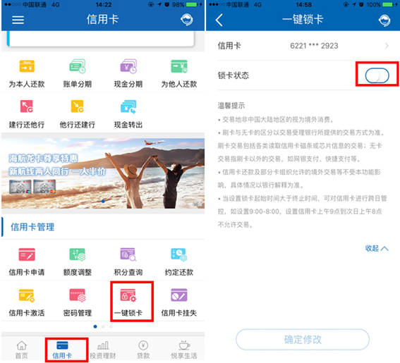 95533答:登录我行手机银行,依次点击 “信用卡-一键锁卡”,选择要操作的信用卡,打开“锁卡状态”,对境外刷卡、境外无卡交易锁卡状态及每日锁卡时段进行设置后,输入短信验证码验证通过即可。