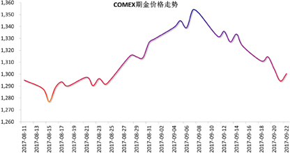 商品市场:上周,因市场对美联储年内加息预期升温,美元走高,国际金价承压,一度触及逾三周低位;但随后因朝鲜局势紧张,市场避险情绪升温,加之美元回落,金价小幅上涨,周五收盘于1300.50美元/盎司,较前一周仍下跌1.74%。