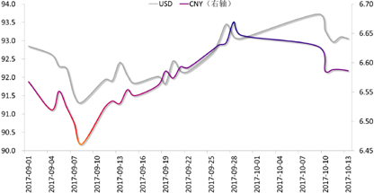 外汇市场:上周,由于欧洲经济数据强劲、西班牙政治风险暂缓和美联储9月会议纪要不及预期鹰派, 美元指数震荡下跌,人民币顺势上涨。加之十九大召开在即,央行行长周小川呼吁放松外汇管制,市场看多人民币情绪升温,但由于客盘购汇力量增强,人民币回吐部分涨幅,周五收于6.5868,当周累计上涨0.91%。短期人民币料将延续区间波动。
