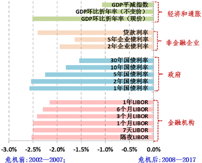 比较危机前和危机后,美国经济名义增速均值下降了2.5%,其中60%是由产出缺口导致(降幅为1.5%),剩下的40%是通胀因素所致(降幅为1%)。而美联储的货币刺激,首先让经济各部类融资利率的降幅均超过1.5%,另外,则让短期国债利率的降幅超过了2.5%。