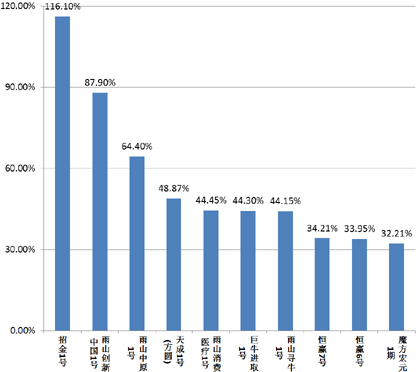 收益表现最好的前十产品中,混合型6款,债券型和股票型各2款。(图10)