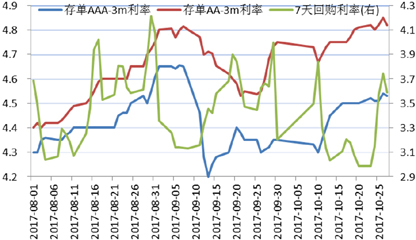 因近期公布的美国经济如9月耐用品新增订单、新建住房销售等数据表现强劲,9月美联储议息会议提升12月加息预期,美国参议员顺利通过2018财年预算案为特朗普税改扫清障碍,以及市场一度传言共和党参议员支持主张更快加息的泰勒当选美联储主席,美国国债收益率持续上扬,尤其长端利率上行幅度较大。截至10月26日,10年期美债收益率较10月13日上行18BP至2.46%。近些年来,随着我国债市对外开放的程度加深,10年期美债收益率的上行,一般会引起10年期中债收益率跟风上行。