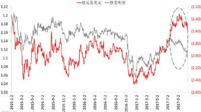 参考美联储退出量化宽松政策的经验,美联储于2013年12月开始缩减购债规模,直至2014年10月完全停止购债,2015年12月开始加息。欧洲央行很有可能效仿美联储,先逐步退出购债再调整利率水平。因此,欧洲央行最早将于明年四季度开始加息。此外,考虑到欧洲央行减少购债将导致欧元区国家的国债收益率走高,欧美利差有望收窄。从利差交易的角度来看,将对欧元形成支撑。但从图形上看,前期欧元涨太快,已经脱离了利差的支撑,短期欧元存在回调的风险。(图1)