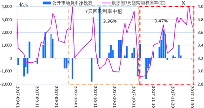 综合来看,缴税、MPA考核和银行冲存款的压力将使12月资金利率中枢较11月有所上行,但央行货币政策维稳、跨年资金提前储备、财政存款集中投放和外汇占款转正,将限制资金利率的上行幅度。预计7天回购利率的12月中枢在3.4%-3.6%区间。