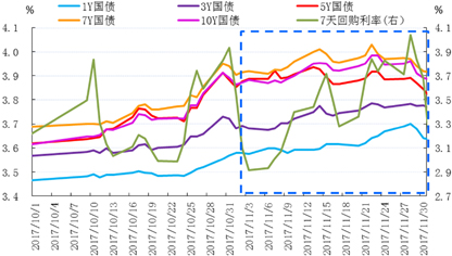 综合来看,基本面向好、资金利率中枢小幅上行、强监管政策促进金融去杠杆、美债收益率上行等因素将推动国内债券收益率上行;在投资者情绪偏弱的作用下,中性因素如政策面都会被解读为利空,唯一的好消息债券供给将明显减少。预计12月如果没有明显利好因素的刺激,债券收益率将易上难下,10年期国债收益率中枢区间在3.8%—4.1%。