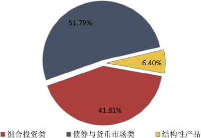 从投向类型来看,债券与货币市场类产品发行了5475款,环比增加1139款,市场占比下降0.84个百分点至51.79%;组合投资类产品发行了4420款,环比增加1039款,市场占比上升0.77个百分点至41.81%;结构性产品发行了677款,环比增加155款,市场占比上升0.07个百分点至6.40%。(图4)