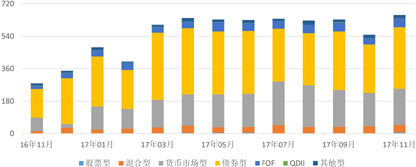 从产品类型看, FOF产品658款,平均月度收益率为0.09%;债券型产品3071款,平均月度收益率为0.05%;货币市场型产品1151款,平均月度收益率为0.05%;QDII产品45款,平均月度收益率为-0.51%;股票型产品217款,平均月度收益率为-1.51%;混合型产品1062款,平均月度收益率为-1.60%;其他型产品115款,平均月度收益率为1.78%。