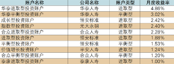 投连险账户业绩表现:月度平均收益率为-0.52%,华泰人寿进取型投资账户表现最佳