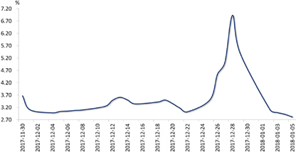 货币市场:尽管上周央行继续暂停公开市场操作,净回笼5100亿元,但年初资金需求减少,市场流动性充裕,7天回购利率大幅下行,基本回归到正常水平。截至上周五,7天回购利率较前一周大幅下行260BP至2.82%。