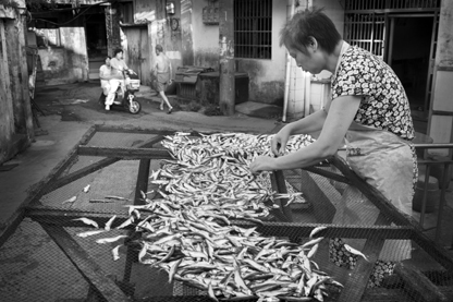 当地渔民史水生夫妇是做批发参鱼干生意的,每天把新鲜的鲦鱼去鳞、去内脏,腌渍后在阳光下翻晒制成鱼干,此味是老绍兴人最爱的 “过酒坯”。