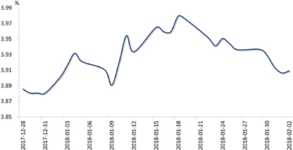 债券市场:上周,受市场流动性宽松、一级市场配置需求旺盛、1月制造业PMI低于预期的影响,债市延续暖势,但美债收益率持续大涨,加之严监管下市场交投谨慎,债券收益率下行空间有限。截至上周五,10年期国债收益率较前一周小幅下行3BP至3.91%。
