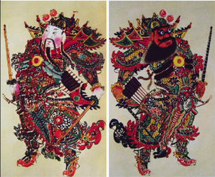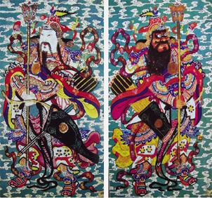 门神既然有两千年悠久的历史承传(当然以桃木形式避邪,可以追溯大更早),最早的形式并不是贴在大门上,因为那是还没有纸张出现,那时以桃木制成偶人立于大门两侧用以驱邪,这源于古人对于桃木的崇拜,以桃木悬于门前,可以镇住四方妖魔鬼怪。桃木是驱邪、降妖的神木;直到唐代以前(虽然在汉代出现了纸张,但是那时的纸是很贵的),人们便将门神刻在门板上,以驱邪避妖。门神以纸质出现大约是在宋代(雕版印刷产生于唐代,至宋已经成熟),并且一直以纸质形式延续到了现在。在一年一度的新春佳节的同时,欣赏不同形式的门神,以助年味,笔者仅举几例: