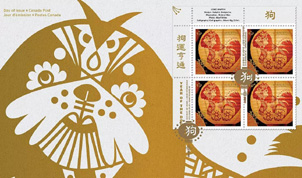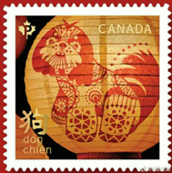 1月15日发行的加拿大狗年邮票由Subplot Design Inc设计公司担纲,邮票插图是华裔图像设计师毛美美的作品,华裔设计师、安省勋章得主伍启荣则负责邮票上的书法字体。寄国内“P”邮资的狗年邮票主图是个发光具有中国风格的传统灯笼,灯笼上画有一头摇尾示好的红色小狗,邮票左下角印有中英文及法文的“狗”字。