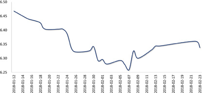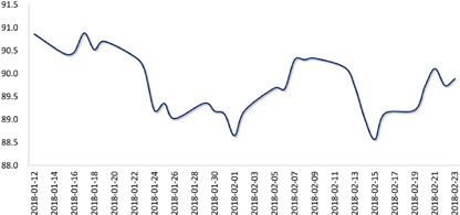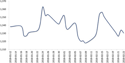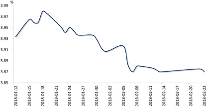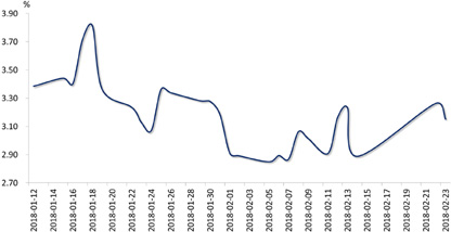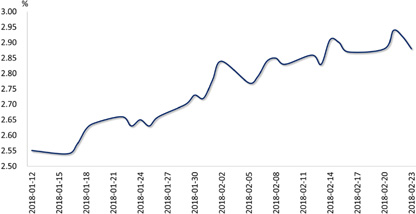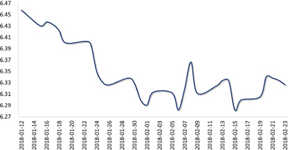 春节前后(2月12日-23日),美元指数V型震荡,在触及88.25的逾三年低位后小幅反弹,两周仍累计下跌0.49%。美元的疲弱提振了境内市场的购汇需求,人民币兑美元价格连续走低,加之春节前后成交清淡,市场流动性不佳,令价格波动增加。与2月7日触及的2015年811汇改后新高6.2519相比,春节前后人民币兑美元跌幅最高达到1.76%,上周五收盘于6.3380,两周累计下跌0.59%。