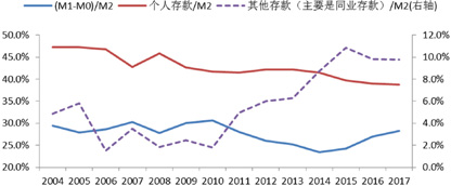 图1 单位货币存款(M1-M0)、个人存款、同业存款在M2中的占比