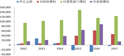 2015年之前,对居民部门债权(贷款及债券)、外汇占款、非银机构债权是创造货币的主要方式。