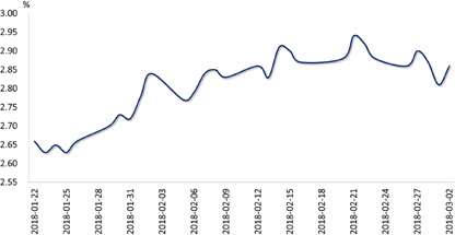 债券市场:上周前四个交易日央行公开市场净投放1400亿,且受一级市场配置需求旺盛、2月官方制造业PMI低于市场预期、隔夜美债收益率下行等因素影响,10年期国债收益率下行。后由于央行公开市场小幅净回笼,且有消息称资管新规或于近期发布,带动10年期国债收益率上行。截至上周五,10年期国债收益率较前一周小幅下行3BP至3.84%。