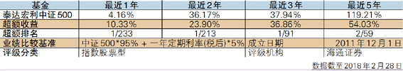 比如泰达宏利中证500基金(基金代码:162216),它每年的业绩表现并不突出,但是截至2018年2月28日,它最近一年、两年、三年的超额收益都在指数股票型基金中排名第一,最近五年的超额收益排名第二。(表)