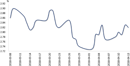 上周,受欧央行官员鹰派讲话和特朗普军事打击叙利亚的言论影响,美元指数承压下挫。但随后美联储公布鹰派会议纪要,加之特朗普对叙利亚的言论缓和,带动美元指数反弹,周五收报89.81,当周仍累计下跌0.37% 。此外,中国国家主席习近平和央行行长易纲在博鳌论坛关于扩大开放的表态,缓解了市场对中美贸易摩擦升温的担忧,一定程度支撑人民币汇价,周五收于6.2825,当周累计上涨0.28%。目前美元指数仍在90附近波动,人民币汇价也暂未明确未来方向,仍维持区间窄幅波动。