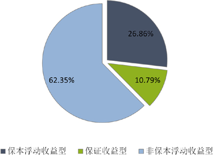 从收益类型来看,保证收益型产品发行了1334款,环比增加569款,市场占比上升1.41个百分点至10.79%;保本浮动收益型产品发行了3321款,环比增加1126款,市场占比下降0.06个百分点至26.86%;非保本浮动收益型产品发行了7710款,环比增加2517款,市场占比下降1.34个百分点至62.35%。(图1)