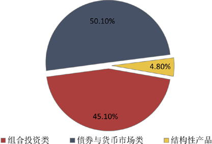 从投向类型来看,债券与货币市场类产品发行了6195款,环比增加2105款,市场占比下降0.06个百分点至50.10%;组合投资类产品发行了5577款,环比增加1890款,市场占比下降0.12个百分点至45.10%;结构性产品发行了593款,环比增加217款,市场占比上升0.18个百分点至4.80%。(图4)