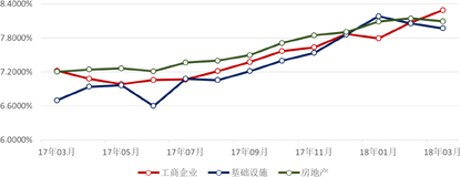 从收益方面来看,1-2(含)年期限段产品平均收益率为8.05%,环比下降1.07个基点,其中,工商企业领域平均收益率为8.29%,环比上升21.86个基点,基础设施领域平均收益率为7.97%,环比下降8.57个基点,房地产领域平均收益率为8.09%,环比下降5.21个基点;2-3(含)年期限段产品平均收益率为8.13%,环比下降24.65个基点,其中,工商企业领域平均收益率为7.50%,环比下降120.00个基点,基础设施领域平均收益率为8.37%,环比下降13.29个基点,房地产领域平均收益率为8.17%,环比下降29.00个基点;3年以上期限段产品平均收益率为6.85%,环比下降23.00个基点。可以看出,各期限段收益下降,期限越长,降得越多,也可以推断短期资金相对于长期资金仍然紧缺,而且市场或有利率下降预期。(图6)