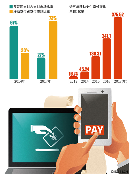 4月26日,中国支付清算协会在北京发布《中国支付清算行业运行报告(2018)》。《报告》统计的数据显示,过去一年移动支付业务延续高增长态势,并对传统的互联网支付业务产生了显著的替代效应。2017年,国内商业银行共处理移动支付业务375多亿笔、金额202多万亿元,同比分别增长46.06%和28.80%。非银行支付机构共处理移动支付业务2390多亿笔、金额105多万亿元,同比分别增长146.53%和106.06%。相比之下,互联网支付业务规模增速放缓或出现下降,2017年非银行支付机构互联网支付和移动支付业务金额之比约为3:7,而2016年这一数据对比是5:5。图/CFP