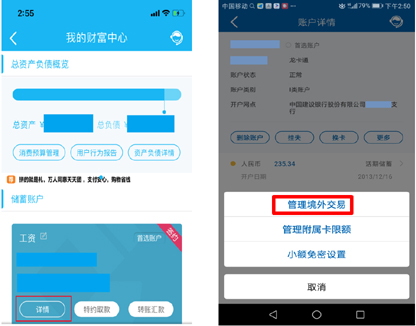 95533答:只要储蓄卡签约我行手机银行服务,即可通过手机银行开通境外交易功能。开通流程:登录我行手机银行,在首页点击“财富”栏,选择待操作银行卡后,依次点击“详情-更多-管理境外交易”,按页面提示操作即可开通。除手机银行外,您还可以通过我行个人网银、网点等渠道进行开通。