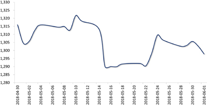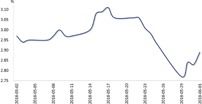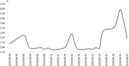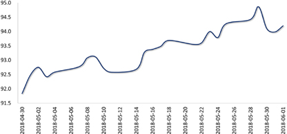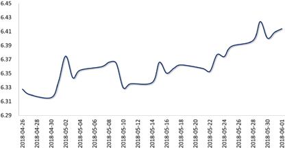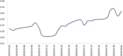 上周初,因意大利政局动荡,引发了市场对欧元区的担忧,欧元承压下跌,美元指数顺势上涨,盘中一度涨破95关口。随后,意大利五星运动党与北方联盟,尝试重新组阁,连续数月的政局动荡有望中止,带动欧元兑美元快速上涨,美指相应回落,周五收于94.20,当周累计下跌0.08%。受美指走势影响,人民币兑美元汇率先跌后涨,当周累计下跌0.43%至6.4169,已连续三周贬值。