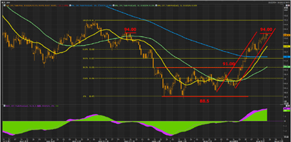 技术图形上看,自4月中旬开始,美元指数进入上升通道,连续突破MA21,MA55,MA200三大均线阻力,中期形态可能已出现反转。目前来看,美元指数底部区间【88.5 91】已完全确立,可能在6月份继续冲击95整数位。我们在上期的策略速递中对本轮美元指数的反弹定位为阶段性反弹,而非长期趋势的反转,预计本轮上涨不超过95。我们的观点总体上没有改变,但是我们注意到5月份新兴市场国家纷纷出现货币危机,如果出现类似于多米诺骨牌的效应,局部危机扩展至其他国家,进而引发至全球危机,美元可能成为避险货币,那么美元指数上涨的力度会很大。由于近期美指涨幅较大,在4小时图出现初步的背离信号,一旦美指跌破93.6,则美元将进行回调。总体上6月份美指仍表现强势,预计美指波动区间为【92,95】。