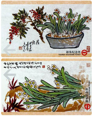 梅花地铁纪念卡,竖卡上的画面是几块石头配上几丛屈曲而上的梅花,给人以素淡闲散的感觉,仿佛几位脱俗高士静卧林间。另外一枚横卡的画面画得是枝干枯老的梅花枝头绽放出朵朵红梅,报春的意象十分明显。