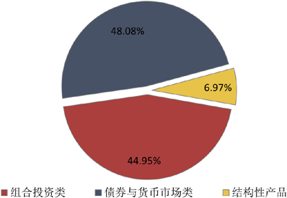 从投向类型来看,债券与货币市场类产品发行了5460款,环比增加23款,市场占比下降1.29个百分点至48.08%;组合投资类产品发行了5104款,环比增加179款,市场占比上升0.22个百分点至44.95%;结构性产品发行了792款,环比增加142款,市场占比上升1.07个百分点至6.97%。(图4)