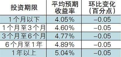 收益表现:各期限类型人民币产品收益水平继续下滑,降幅均为0.05个百分点