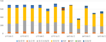 本月共有37家证券公司或其子公司发行了490款券商理财产品,环比增加35款,升幅为7.69%,平均首发规模9.64亿元,环比增加2.65亿元,升幅为37.90%。其中,债券型产品发行了281款,环比增加8款,升幅为2.93%,平均首发规模10.45亿元,环比增加2.65亿元,升幅为33.96%;货币市场型产品发行了135款,环比增加6款,升幅为4.65%,平均首发规模0.75亿元,环比减少0.08亿元,降幅为9.88%;混合型产品发行了24款,环比减少1款,降幅为4.00%,平均首发规模5.98亿元,环比增加2.77亿元,升幅为86.10%;股票型产品发行了1款,环比持平;QDII产品发行了1款,环比减少2款,降幅为66.67%,平均首发规模46.28亿元,环比减少3.72亿元,降幅为7.44%;FOT产品发行了3款,环比减少1款,降幅为25.00%,平均首发规模0.89亿元,环比减少17.10亿元,降幅为95.03%;FOF产品发行了13款,环比增加5款,升幅为62.50%,平均首发规模46.28亿元,环比减少3.72亿元,降幅为7.44%;其他型产品发行了32款,环比增加20款,升幅为166.67%,平均首发规模0.89亿元,环比减少17.10亿元,降幅为95.03%。(图9)